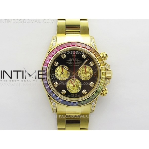 Daytona 116589RBOW YG Rainbow Crystal APSF Best Edition Black Dial on SS Bracelet A7750 > Rolex